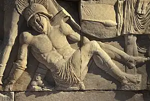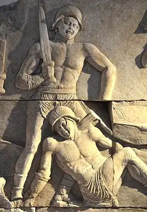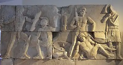 Along the blocks are depicted in relief, without interruption and according to well-attested models, episodes of combat involving six pairs of gladiators, while in the background there are players.[1]