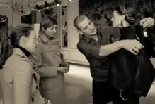 In 2010 Pitti Discovery Foundation selects Kibardin to present a world premiere of his Behind the Shoes project. Kibardin poses twice wearing the classic gray dress of the artist. In the first portrait the dress is perfectly buttoned and impeccable, in the other Kibardin jokingly exposes the wonder of human contradictions.[34][35][36][37]
