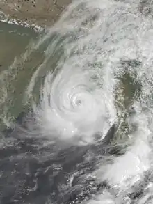 About a day before the cyclone would make landfall in Bangladesh, officials in the country raised the highest danger signals and evacuated numerous residents.[3] According to the ACT Development, roughly 500,000 people evacuated low-lying coastal areas across the country.[4] However, according to The Washington Post, several million people evacuated ahead of the cyclone's arrival. In response to the threat of a major disaster, the International Red Cross and Red Crescent Movement sent up to 33,000 volunteers to assist in evacuation efforts.[5] The ACT Development set up shelters in the Cox's Bazar District, housing roughly 40,000 people, and their Disaster Preparedness Unit kept close contact with other organizations to prepare post-storm relief efforts.[4] Initially, there were fears that the storm may become a repeat of the 1991 Bangladesh cyclone which killed 139,000 people; however, the storm turned towards the northeast prior to landfall, preventing the worst of the storm surge from directly striking the coast. Additionally, the system ended up hitting at low-tide instead of high-tide as initially feared.[6] Had it struck at high tide, it is estimated that a storm surge of 6 m (20 ft) would have inundated much of the Bangladeshi coastline.[4]