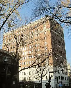 The Mayfair Apartments are a historic apartment hotel at 1650–1666 E. 56th Street in the Hyde Park neighborhood of Chicago. Built in 1926, the building was part of a wave of residential department in Hyde Park, and it was one of several apartment hotels constructed there in the late 1910s and 1920s. Apartment hotels were popular among wealthy workers looking for part-time city housing, as they combined the amenities and prestige of a hotel with the price and location of apartments.[2] The architecture firm Lowenberg & Lowenberg designed the building in the Georgian Revival style. The building's first three stories are clad with limestone and decorated with flat Corinthian columns and balustrades on the second-story windows. The remainder of the building is brick and includes a dentillated cornice at its roof and a second cornice above its eleventh story.[3]