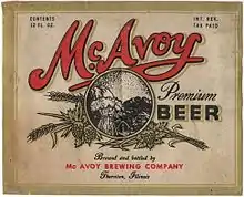 McAvoy Brewing Company (founded in 1865 as Bemis & Rindge Brewery by Henry V. Bemis) was run by John H. McAvoy in Chicago, Illinois and was one of Chicago's largest breweries before Prohibition.[2] Coinciding with the Eighteenth Amendment going into effect on January 16, 1920, the brewery closed in 1920.[3]