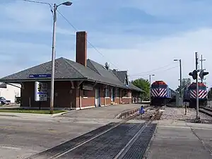 McHenry is a station on Metra's Union Pacific Northwest Line, located in McHenry, Illinois. The station is the terminus of the McHenry Branch of the Northwest Line; inbound trains operate as far as Ogilvie Transportation Center in Chicago. The station is also the only station on the McHenry Branch after it splits off at Pingree Road, although the line previously extended to Williams Bay, Wisconsin. Proposals exist to expand service on the line by adding stations in Prairie Grove and Johnsburg. It is the fifth furthest Metra Station from Chicago after Harvard, Antioch, Woodstock, and Kenosha, at 50.47 miles (81.22 km). Most Northwest Line trains operate along the Harvard branch to Harvard or Crystal Lake rather than the McHenry Branch. The station only has one track and one platform due to the low number of trains that serve the station. Two storage tracks are used to store two trains during overnight hours as well as weekends and holidays. The station is located at grade level. There is one grade crossing of a road at the station, which is placed under a Federal Railroad Administration horn quiet zone.[2] As of 2018, McHenry is the 198th busiest of the 236 non-downtown stations in the Metra system, with an average of 85 weekday boardings.[1]