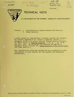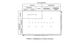 - 1 2 3 Kleppe, Thomas S.; McKelvey, V. E. (1976). Principles of the mineral resource classification system of the U.S. Bureau of Mines and U.S. Geological Survey : Geological Survey Bulletin 1450-A (PDF). Washington, D.C.: United States Government Printing Office. p. A2. Retrieved 2 September 2021.