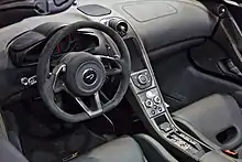 The interior includes Alcantara as the standard upholstery material and the infotainment system is based on the same unit used in the P1. Optional carbon fibre sports seats reduce the weight of the car by 15 kg. The interior focus on a symmetrical design language which McLaren claims reduces the shift time required by the owner to learn about the car's functions. The portrait infotainment screen is improved over the 12C and the sat nav system is now easily accessible.[12]