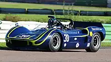 The McLaren M1A, and its derivatives, the McLaren M1B[4] and the McLaren M1C, are a series of mid-engined Group 7 sports prototype race cars built by McLaren, between 1963 and 1968.[5][6][7][8] The M1A was the team's first self-designed and developed sports car. Later versions, such as the 'M1B' and 'M1C', competed and raced in the North American Can-Am series, starting in 1966 season.[9][10][11] The car was raced in North America and Europe in 1963 and 1964 in various Group 7 and United States Road Racing Championship series events. 24 examples of the M1A and M1B were built, and 25 examples of the M1C were manufactured.[12] They were powered by a few different motors, including Chevrolet small-block engine, an Oldsmobile V8 engine, a Chevrolet big-block engine, and even a Ford FE engine.[13][14] It was constructed out of a tubular space frame chassis, and, combined with its light weight of 551 kg (1,215 lb) this gave it a great power-to-weight ratio.[15] The 4.5 L (270 cu in) Oldsmobile V8 engine developed around 310 hp (230 kW),[16] while the 350 cu in (5.7 L) Chevrolet small-block V8 engine was capable of developing over 550 hp (410 kW), and 538 lb⋅ft (729 N⋅m) of torque.[17][18] This drove the rear wheels through a Hewland L.G.500 four-speed manual transmission.[19]