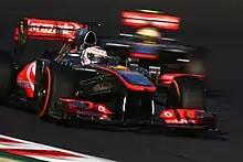 The McLaren MP4-28[7] is a Formula One racing car designed and built by the McLaren team for use in the 2013 Formula One season. The chassis was designed by Paddy Lowe,[8] Neil Oatley, Tim Goss, Mark Ingham and Marcin Budkowski and was powered by a customer Mercedes-Benz engine. It was driven by 2009 World Champion Jenson Button and Sergio Pérez,[5][6] the latter joining the team after Lewis Hamilton moved to Mercedes.[9] The car was launched on 31 January 2013,[7][10] as part of the team's fiftieth anniversary celebrations.[11] It was also the last McLaren car to feature major sponsorship from Vodafone, a partnership that flourished for seven years, beginning in 2007 on the MP4-22.