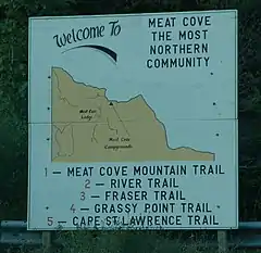 Meat Cove is the most northerly settlement in Nova Scotia and is located in the Sydney—Victoria federal electoral district. It's accessed north of Capstick on 8 km of a gravel road.[1]