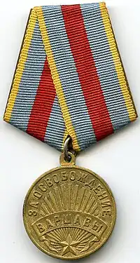 The Medal "For the Liberation of Warsaw" (Russian: Медаль «За освобождение Варшавы») was a World War II campaign medal of the military established on June 9, 1945 by decree of the Presidium of the Supreme Soviet of the USSR[1] to satisfy the petition of the People's Commissariat for Defence of the Soviet Union.