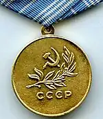 The Medal "For the Salvation of the Drowning" (Russian: Медаль «За спасение утопающих») was a state decoration of the Soviet Union awarded to citizens of any nationality for courage and resourcefulness in rescuing people from drowning. It was established on February 16, 1957 by decree of the Presidium of the Supreme Soviet of the USSR.[1] Its statute was twice amended by further decrees of the Presidium of the Supreme Soviet of the USSR, first on August 1, 1967[2] and lastly on July 18, 1980.[3] The medal ceased to be awarded following the December 1991 dissolution of the Soviet Union; an interim design with "Russia" replacing the "USSR" on the reverse was awarded a few times until it was replaced in 1994 by the Russian Federation's Medal "For Life Saving".