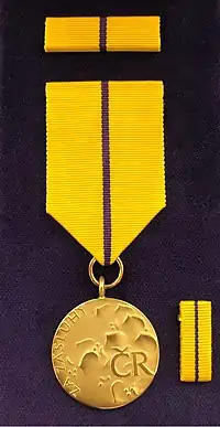 The Medal of Merit (Czech: Medaile Za zásluhy) is an award of the Czech Republic which comes in three grades, the First Grade being the highest. It is awarded to people for service to the Republic in a number of different public areas, including: “the economy, science, technology, culture, arts, sports, enlightenment and education, defense and security of the state and the people”.[1] The medal was designed by Jiří Harcuba.
