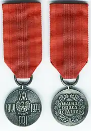 The Medal of the 30th Anniversary of People's Poland (Polish: Medal 30-lecia Polski Ludowej) is a former civil decoration of Poland established by the Council of State on 7 February 1974 to recognize contribution of working people in development of the country. It was awarded between 7 February 1974 and 31 December 1974.[2] It was disestablished in 1992.[3]