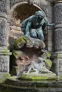 Since the fountain no longer stood against a wall, the Fontaine de Léda, displaced from another neighborhood, was placed directly behind it. (See the Fountain of Leda, below.) He replaced the two original statues of nymphs at the top of the statue with two new statues, representing the Rivers Rhone and Seine. He restored the coat of arms of the Medici family over the fountain, which had been defaced during the Revolution. He inserted two statues into the niches, one representing a faun and the other a huntress, above which are two masks, one representing comedy and the other tragedy. He removed the simple basin and water spout which had been in the niche and replaced them with a long tree-shaded basin. Finally, he removed the statue of Venus and replaced her with a group of statues by Auguste Ottin, representing the giant Polyphemus, in bronze, discovering the lovers Acis and Galatea, in white marble. The fountain was completely cleaned during the summer of 2021, and that is the fountain as it appears today.[5]