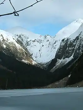 ![]() Looking up from the Medvejie Lake valley from near the end of the frozen-over lake | |