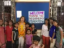 Gandhi is the founder and CEO of The Giving Back Foundation, a foundation geared towards alleviating illness, poverty and suffering while also addressing education issues which affect women and children around the world. Through her Foundation, Gandhi devotes her life to charity and help for those in need, notably abused and hungry children, widows, the sick, the deaf and blind. She is particularly interested in education as the stepping stone to success.[4] Gandhi has supported charities with strong female leadership programs and workshops, in part because of the role models in her life: Hillary Clinton, Cherie Blair, and Gandhi's own mother, an Irish woman living in India. These charities include the Cherie Blair Foundation for Women in the United Kingdom and the Eleanor Roosevelt Leadership Center in the United States.[5]
