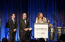 ![]() Gandhi speaking at Maestro Cares Foundation event alongside Marc Anthony and Henry Cardenas | |