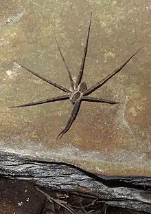 Megadolomedes is a genus of spider in the family Pisauridae. The genus contains only one species, Megadolomedes australianus,[1] commonly known as the giant water spider. It is one of Australia's largest spiders, with a legspan of up to 18 cm. Found near creeks and ponds, it is capable of running on water. Food includes small fish, tadpoles and aquatic insects. Air is trapped on body and leg hair, allowing them to stay underwater for long periods of time.[2][3][4]