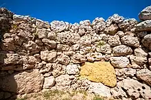 The temple's façade is typical, with a trilithon entrance, a bench and orthostats. It has a wide forecourt with a retaining wall, through which a passage runs through the middle of the building.[59] This entrance passage and first court follow the common, though considerably modified, Maltese megalithic design.[60] A separate entrance gives access to four enclosures, which are independent of each other and replace the north-westerly apse.[61]