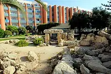 The centre of the façades is usually interrupted by an entrance doorway forming a trilithon, a pair of orthostats surmounted by a massive lintel slab.[31][32] Further trilithons form a passage, which is always paved in stone. This in turn opens onto an open space, which then gives way to the next element, a pair of D-shaped chambers, usually referred to as 'apses', opening on both sides of the passage. The space between the apses' walls and the external boundary wall is usually filled with loose stones and earth, sometimes containing cultural debris including pottery shards.[33]