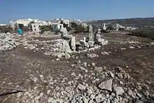 The Ta' Ħaġrat temple in Mġarr is on the eastern outskirts of the village, roughly one kilometer from the Ta' Skorba temples.[46] The remains consist of a double temple, made up of two adjacent complexes, both in the shape of a trefoil. The two parts are both less regularly planned and smaller in size than many of the other neolithic temples in Malta, and no blocks are decorated.[47] Sir Temi Żammit excavated the site in 1925–27. A village on the site that pre-dates the temples by centuries has provided plentiful examples of what is now known as Mġarr phase pottery.[48]