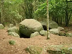 Megaliths in Mecklenburg-Vorpommern are the subject of an abundance of lore, dealing primarily with giants, fairies, dwarfs, subterraneans and hidden treasures.[19] The giant tales relate primarily to the megaliths' creation, which was assumed to be the result of stones lost or thrown by giants, or of giants building houses, ovens or tombs.[19] Thus, the population refers to dolmens as Hünengräber ("giants' tombs", Sg. Hünengrab).[19][20]