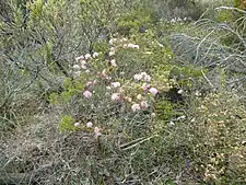 The flowers are a shade of pink to purple and are arranged in heads on the ends of branches which continue to grow after flowering, sometimes also in the upper leaf axils. The heads are up to 18 mm (0.7 in) in diameter and contain 5 to 12 groups of flowers in threes. The petals are 0.7–1.5 mm (0.03–0.06 in) long and fall off as the flower ages. The stamens are arranged in bundles of five around the flower, usually with 4 to 6 stamens in each bundle. The flowering season is mainly in spring but has been recorded as early as April. The fruit are woody capsules, 2–3 mm (0.08–0.1 in) long forming roughly spherical clusters around the stem.[2][3]