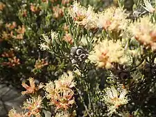 The flowers are arranged in heads near the ends of branches which continue to grow after flowering, sometimes in the upper leaf axils. There are one to four groups of three flowers in each head, the heads up to 15 mm (0.6 in) in diameter. The flowers appear in spring and are initially pale yellow to creamy-white but fade to pinkish-red. The petals are 0.8–1.2 mm (0.03–0.05 in) long and fall off as the flowers age. The stamens are arranged in bundles of five around the flower, with 6 to 13 stamens in each bundle. Flowering occurs from August to November and is followed by fruit which are woody capsules 3–5 mm (0.1–0.2 in) long in clusters.[2][3]