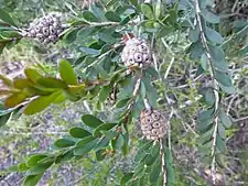 The lavender to rose pink "pom-pom" flowers appear over a long period from spring to mid-summer. The flowers are arranged in heads or short spikes on the ends of branches which continue to grow after flowering and sometimes also in the upper leaf axils. The heads are up to 30 mm (1 in) in diameter and contain between 2 and 20 groups of flowers in threes. The fruit are woody capsules 3–5 mm (0.1–0.2 in) long, arranged in roughly spherical clusters about 20 mm (0.8 in) in diameter.[3][4][5]