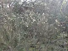 The flowers are cream coloured to bright yellow and are arranged in heads on the ends of branches which continue to grow after flowering and sometimes also in the upper leaf axils. The heads are up to 18 mm (0.7 in) in diameter with 2 to 13 groups of flowers in threes. The petals are 1.0–2.2 mm (0.04–0.09 in) long and fall off as the flower matures. The outer surface of the floral cup (the hypanthium) is hairy and there are five bundles of stamens around the flower, each with 6 to 8 stamens. Flowering occurs mainly in spring and is followed by fruit which are woody capsules, 2.0–2.5 mm (0.08–0.1 in) long, packed tightly together in spherical or oblong clusters.[2][3]