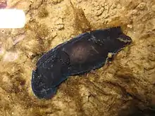 Adults are between 15 and 25 mm in length but may reach a maximum size of 30 mm.[3] Body is long and cylindrical in shape with a uniformly black colour that may feature an iridescent blue sheen.[4] The head shield is rounded with an indentation that may resemble two 'tails'.[3] The parapodia are small and held tightly against sides of body.[3] A large muscular mouth part (known as the buccal bulb) is contained in the anterior half of the body cavity.[4]