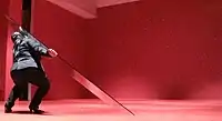 In Suryodarmo's 2001 piece Lullaby for the Ancestors she repeatedly walks in a circle around a horse while cracking a whip then dunks her head in a bucket of water.[7] The work is based on Jaran Kepang, a traditional Javanese dance where the dancers enter a trance and endure physical trials.[8]