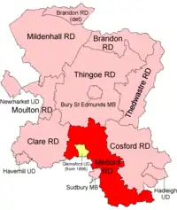 Melford Rural District was a rural district in the county of West Suffolk, England. It was created in 1894, under the Local Government Act 1894 from that part of the Sudbury rural sanitary district in West Suffolk (the rest becoming Belchamp Rural District in Essex). It was named after Long Melford and administered from Sudbury.[1] Shortly after its creation, in 1896, the parish of Glemsford was made a separate urban district.