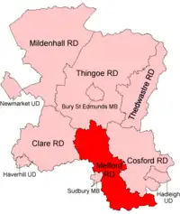 On 1 April 1935 it lost the parishes of Cavendish and Hawkedon to the Clare Rural District. At the same time the Glemsford Urban District was abolished and restored to the district.[2]