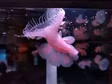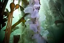 Melibe leonina are capable swimmers, however, they have rarely been observed leaving their substratum.[3] M. leonina swim through a behavior known as lateral bending.[10] Individuals swim by first closing their oral hood and releasing themselves from their substrate.[10] Next, they curl their foot and extend their cerrata.[10] They then flatten their body laterally, to create more surface area.[10] To propel themselves forward they bend their body from side to side, forming a "C" shape.[10][12] M. leonina are capable of trapping air in their hood for buoyancy.[12]