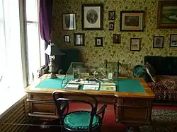 Chekhov lived in the one-story main house with his mother, his sister, Maria Chekhova, and his father, Pavel Yegorovich Chekhov. He had his study and library with a desk by a window looking at the garden. His desk portraits of the writers and artists he most admired; Lev Tolstoy, Ivan Turgenev, Peter Tchaikovsky, Dmitry Grigorovich, and Viktor Goltsev. In his early years at Melikhovo, his study also served as his medical office, where he saw patients. Sick residents of the region began gathering outside the house from five to six o'clock in the morning. He kept medicines in a cabinet on the wall of his study for his patients. He was particularly busy during the cholera epidemic which struck Russia in 1892 and 1893; he was responsible for the medical care for 26 villages, seven factories, and a monastery in the region.[5]