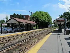 Historically the primary station in Melrose, it has always been supplemented by nearby Wyoming Hill station and Melrose Highlands station.[2] The original station was on the east side of the tracks; it was replaced by a newer station on the west side and converted for use as a freight house.[3][6][7] Neither station building is extant, though sections of the platform roofs remain as shelters.[8]