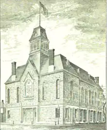 After nearly 200 years of Town government, the Town Meeting decided to build a town hall on Bullard Street in 1828.[1][2] By 1858, however, a town committee was complaining that "the present town house is neither in location, size, or style, sufficient to meet the reasonable requirements of the town."[2][3] It was too far away from the center village and too ugly they said, and though there were over 1,000 voters in the town the building could not accommodate more than 275.[4] Town meetings were frequently crowded and confused in the townhouse, and it was difficult to hear speakers and determine votes.[4]