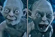 Peter Jackson's 2002 film The Lord of the Rings: The Two Towers depicts Gollum/Sméagol talking to himself in "perhaps the most celebrated scene in the entire film". The scene uses the device of shot/reverse shot to switch between the two personalities, who are represented as two different CGI characters. The scholar of film Kristin Thompson writes that Jackson and Fran Walsh, who directed the scene, suggest the mental conflict using a "subtle combination of framing, camera movement, editing, and character glances."[1] Thompson comments that the scene's ability to make the viewer "apparently see two characters arguing with each other when only one is actually present creates an eerie, even astonishing moment that transcends the presentation in the book".[1]