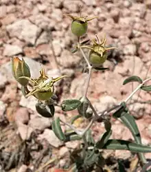 The inflorescence is a cluster of flowers with pale yellow to nearly white petals up to 1.4 centimeters long. The fruit is a cup-shaped utricle under a centimeter wide which contains many lens-shaped, bumpy seeds about 3 millimeters wide.