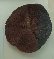 The red heart urchin has a somewhat flattened, heart-shaped test made of closely fitting, calcium carbonate plates. These are covered by short, dense, moveable spines situated on small tubercles. The test is a dark reddish-brown colour and the spines a little paler. Although it has pentagonal radial symmetry, it also has some degree of bilateral symmetry as one of the interambulacral areas is undeveloped and only four are apparent. The mouth is on the oral (under) surface near the anterior end and the anus at the posterior end.[2][3][4][5]