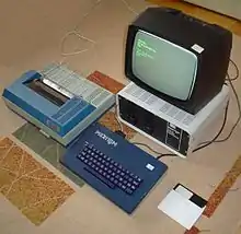 Meritum II with a printer, monitor and floppy disk unit.