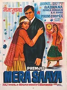 Mera Saaya (transl. My Shadow) is a 1966 Indian Hindi-language thriller film directed by Raj Khosla. The music is by Madan Mohan and lyrics by Raja Mehdi Ali Khan. The film stars Sunil Dutt and Sadhana. The film is the second of the suspense-thriller trilogy of Khosla-Sadhana partnership, the other two being Woh Kaun Thi (1964) and Anita (1967).[2] The film became a box office success.[3] It is a remake of the Marathi film Pathlaag (The Chase).[4]