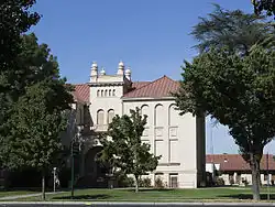 Merced County High School, also known as the County Library Building, is a historic building located at 2125 M St. in Merced, California, United States. Built in 1897, the school was the first public high school in Merced County. The brick and wood building was designed in the Richardsonian Romanesque style and featured a hip roof with cross gables, a rounded entry, windows arranged in a ribbon patter, and a since-removed wooden tower. The school's brick exterior was later plastered over and its roof painted red, giving the building a Mission Revival appearance. The building served as a high school until 1920; in the following year, the county library moved into the building, where it remained until 1976.[2]