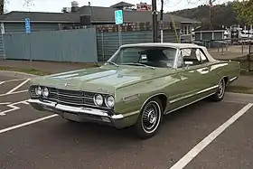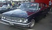 While again derived directly from the Ford Galaxie, the exterior of Mercury sedans adopted multiple design elements from the popular Lincoln Continental, branding the entire Mercury model line designed "in the Lincoln Continental tradition".[47] In place of the vertically stacked headlights of Ford, the Monterey adopted four horizontal headlamps; the grille was styled similar to the Continental, adopting straight-lined front fenders. The rear fascia was also styled similar to the Continental (adding two taillamp lenses to the bumper); all vestiges of the tailfins were removed. The Monterey was now offered in six body styles, offering two-door and four-door sedans, a four-door sedan with a "Breezeway" rear window, two-door and four-door hardtops, and a two-door convertible.[48][49] The Breezeway roof was now limited to 4-door sedans; as an alternative, hardtops were fitted with passive "flow-through" ventilation.[47] In 1965 the Mercury Commuter station wagon returned to the Monterey line as a lower priced alternative to the Colony Park station wagon that was now part of the Park Lane model line.[24]