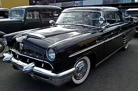 A station wagon was first introduced as a Mercury for 1953 including an optional "woodie" appearance, the same year a Siren Red Monterey Convertible became Ford's forty-millionth car produced.[8] 1954 saw the introduction of the new 161 hp (120 kW) overhead valve Ford Y-block V8, as well as the bubble-top Monterey Sun Valley, named for Sun Valley, Idaho, which had a Plexiglas front half roof which was similar to that of the Ford Crestline Skyliner. The color choices expanded considerably to offer fifteen single choices and thirty nine two-tone selections.[1] The 1954 Montereys also received other alterations, such as new, lower taillights. The Mercury XM-800 concept car, first displayed at the Chicago Auto Show early in 1954, débuted as the Mercury Monterey XM-800.[9][10][11]