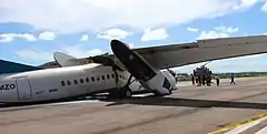 On 10.15 a.m, Flight 6517 bounced three times[2] and slammed onto the tarmac.[3] It broke into two sections.[4] Both the left wing and the right wing were bent forward (the entire wing structure was separated intact from the fuselage which collapsed under its own weight) and both propellers were destroyed. Eyewitness recalled that there was a massive explosion when the crash occurred.[5] It then skidded for several meters. After the aircraft stopped, the flight attendants assessed the situation and decided to evacuate the passengers through the rear main entrance door.[6]