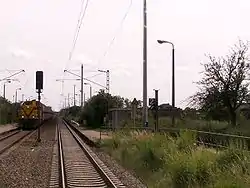 The Merseburg–Halle-Nietleben railway is an about 19 kilometre-long electrified branch line in the German state of Saxony-Anhalt. A second track exists between Merseburg and Merseburg-Elisabethhöhe and between Halle-Zscherbener Straße and Halle-Nietleben. Part of the current route was built in 1967 with a significant realignment of the Zwiebelbahn on the (Merseburg–) Bad Lauchstädt–Angersdorf route.