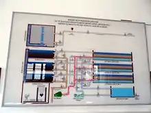 The building consists of a ground floor and a basement. In the ground floor there are a dosing room with an aluminium sulfate smasher, a ventilation room, a chlorination room, three filter pools and a staff room. The basement, called manoeuvre room is reserved for the control of the main valves.