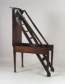 Metamorphic library steps are a type of archaic dual-use furniture, consisting of a small folding staircase that can be transformed into chair or desk form (such as a small writing table or library table). In desk form, it can also be considered a mechanical desk.