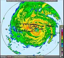 Expansion of the central dense overcast and an increasingly complete eyewall signaled steady intensification throughout the night of September 17–18.[11] Considerable lightning activity was identified within the hurricane's core early on September 18 and statistical models indicated a high probability of rapid intensification.[12] Explosive strengthening took place shortly thereafter, with aircraft reconnaissance finding surface winds of 120 mph (190 km/h) and a central pressure of 959 mbar (hPa; 28.32 inHg), making Maria a Category 3 hurricane on the Saffir–Simpson scale, and hence a major hurricane. Additionally, radar data revealed a well-defined 12 mi (19 km) wide eye.[13] The eye contracted slightly to 9 mi (14 km) as intensification continued.[14]