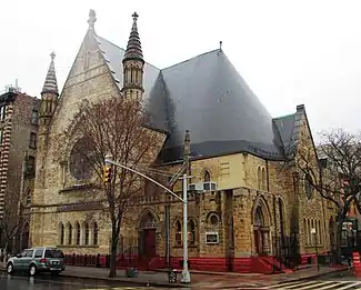 The Metropolitan Baptist Church, located at 151 West 128th Street on the corner of Adam Clayton Powell Jr. Boulevard in the Harlem neighborhood of Manhattan, New York City, was originally built in two sections for the New York Presbyterian Church, which moved to the new building from 167 West 111th Street.[3] The chapel and lecture room were built in 1884-85 and were designed by John Rochester Thomas, while the main sanctuary was constructed in 1889-90 and was designed by Richard R. Davis, perhaps following Thomas's unused design.[1] A planned corner tower was never built.[3]